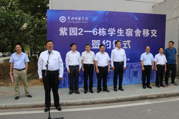 王立兵代表学校致辞。他对黄冈市委市政府、黄冈高新技术产业开发区对我校发展的高度重视,以及珠明山社区的大力支持表示衷心感谢。他指出,移交仪式只是整体移交的开始,紫园(2-6)五栋学生宿舍将纳入全校统一管理、统一建设、统一服务,以更完备的设施和更高水平的服务来回报黄冈市委市政府的信任以及珠明山社区的大力支持。王立兵表示,我校将启动五栋学生宿舍的检修,以及明年暑假全面改造的各项准备工作,为学生提供更优质的住宿环境。我校将继续立足于高新区及珠明山社区,积极为地方经济发展服务,也期盼高新区及珠明山社区更多地、更大力度地参与到我校南北校区乃至东校区的建设过程中,希望和珠明山社区良好的合作关系能为我校办学营造更加良好的氛围。