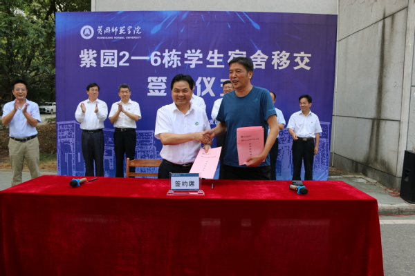 本网讯9月2日下午,黄冈师范学院紫园2-6栋学生宿舍移交签约仪式举行。黄冈市人民政府副市长、黄冈高新技术产业开发区管委会党工委书记周勇士,校党委书记王立兵,校长陈向军,党委副书记、纪委书记李金奇,副校长马志斌,党委常委、校长助理汪晓凌,党委常委王锋,珠明山社区党委书记、居民委员会主任陈金鱼出席签约仪式。仪式由黄冈高新技术产业开发区管委会副主任王俊明主持。