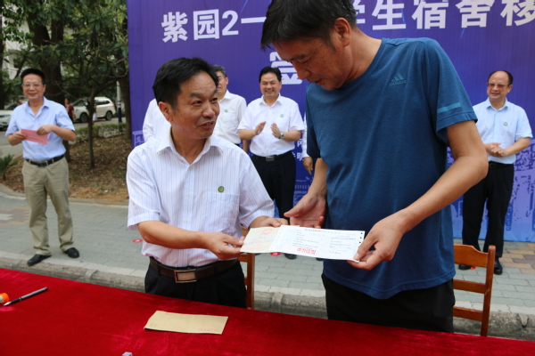 汪晓凌代表学校向珠明山社区居民委员会支付2018年度紫园(2-6)五栋学生宿舍结算款项。
