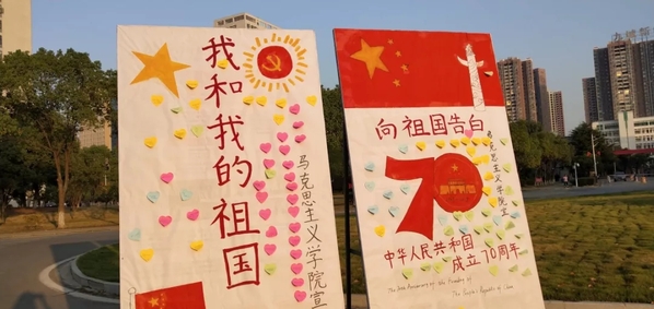 在画板上,学生们纷纷写下自己对祖国的祝福的话语,一张张、一条条,流露出学子们对祖国的热爱之情。马克思主义学院教师代表学生党员、入党积极分子、学生干部及大一全体同学参加升旗仪式。