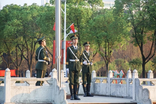 庄严的升旗仪式拉开帷幕,校国旗护卫队担任升旗手、护旗手的队伍护送神圣的五星红旗,步调统一、步伐坚定地正步走向升旗台。全体师生挺拔肃立,齐迎国旗,雄壮的国歌奏响,鲜艳的五星红旗冉冉升起,神圣、庄严的氛围感染着在场的每一个人。